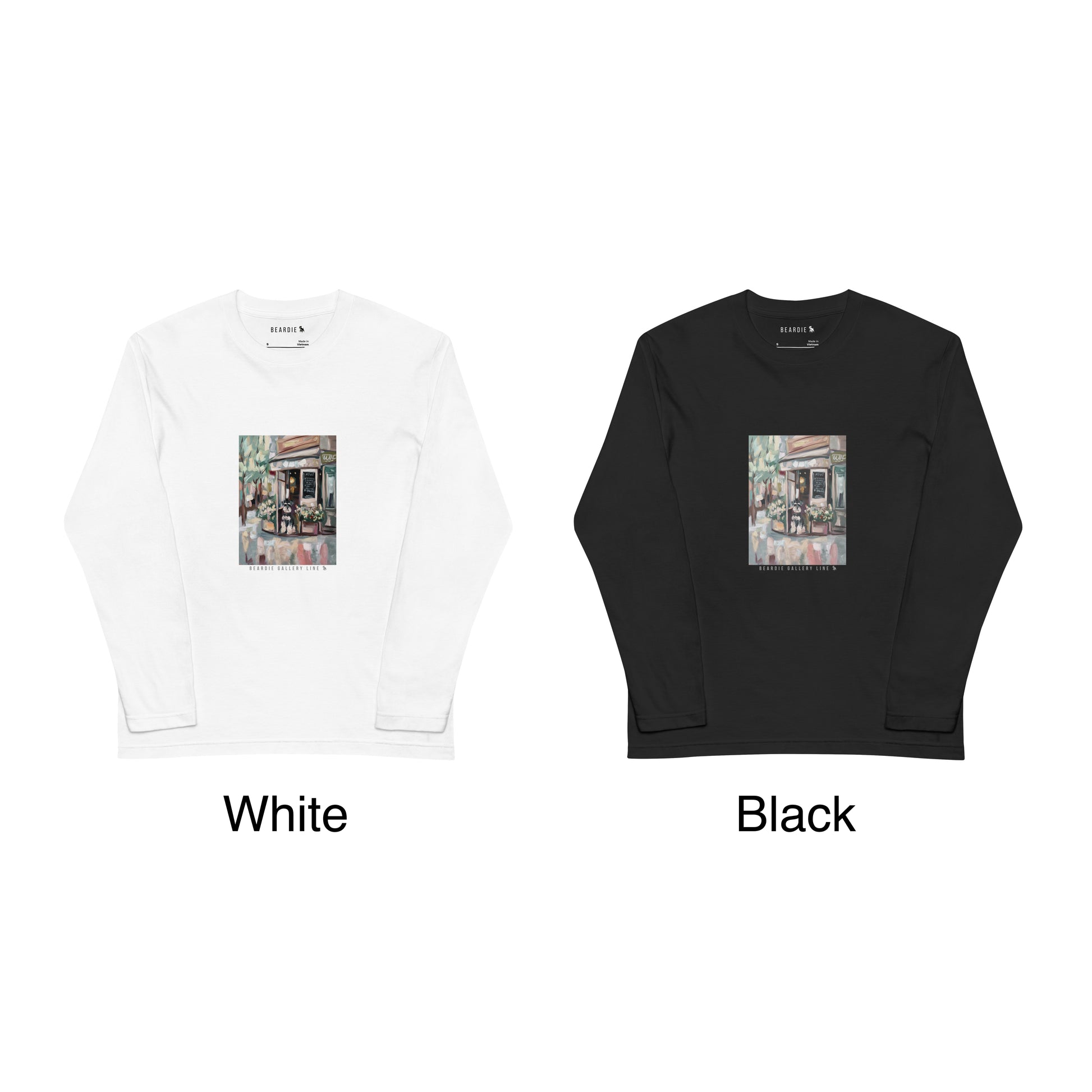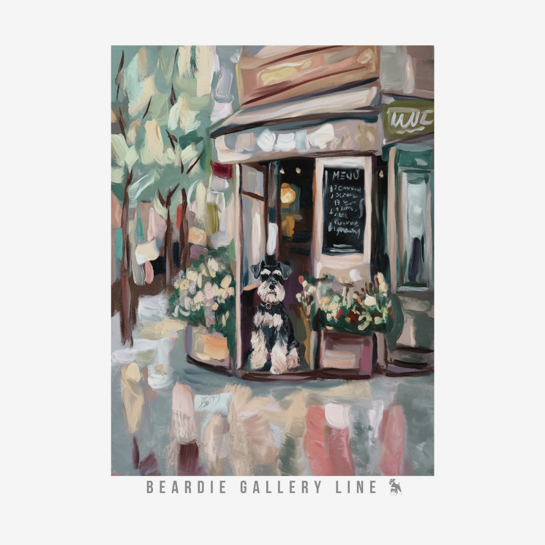 シュナウザーがカフェの前でお出迎えする姿を描いたロングTシャツ。