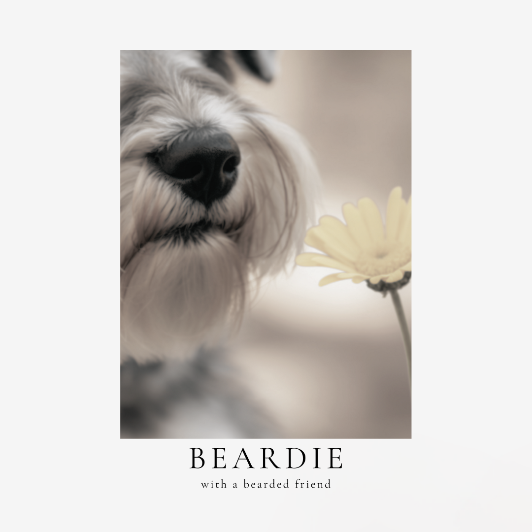 シュナウザーのやさしい鼻先が、咲いた花にそっと近づく──