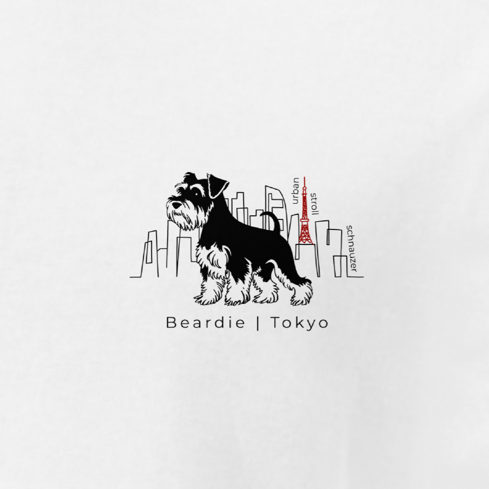 シュナウザーが東京の街をスタイリッシュに散歩するTシャツ。